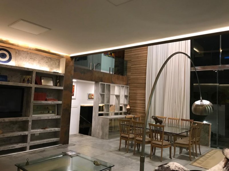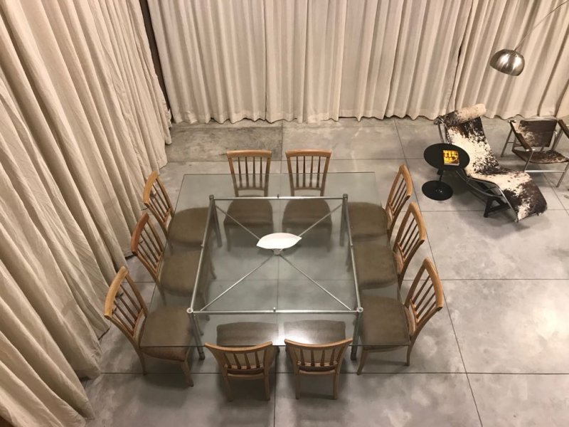 PAVIMENTO TÉRREO: Primeira suíte completa de armários com espelho, bancada para estudo, painel de TV, cômoda, ventilador de teto, ponto de ar-condicionado, ponto de internet, cortina com blackout. Banheiro com pia esculpida, box de vidro verde, porta toalheiro e chuveiro em inox, ducha higiênica. Sala com pé direito duplo de 8m de altura para três ambientes com 60 m², estante embutida, aparador de Buffet, com um terraço a frente de 30 m², seguida de uma piscina com 60 m² com deck seco de 50 m2²com uma churrasqueira, balcão, pia e lavabo. Cercada por jardins. Copa/Cozinha com de 40 m² com uma ilha toda em mármore, composta de uma mesa de vidro embutida na ilha com 6 lugares, cooktop, pia no balcão com torneira gourmet, torre com forno e micro-ondas, geladeira e freezer, armários planejados, dispensa, cristaleira. E mais a cozinha externa composta de fogão e geladeira. Área de serviço com guarda roupas para roupas passadas, dois gavetões para roupas lavadas e roupas sujas, tábua de passar embutida, ponto de água quente para máquina de lavar. Dependência de empregada (suíte) com armários embutidos, ponto de internet, painel de TV, ventilador de teto, ponto de ar-condicionado, banheiro com box de vidro verde. Garagem para 4 carros, dois portões em alumínio branco com pintura eletrostática automatizados com motores de excelente qualidade.